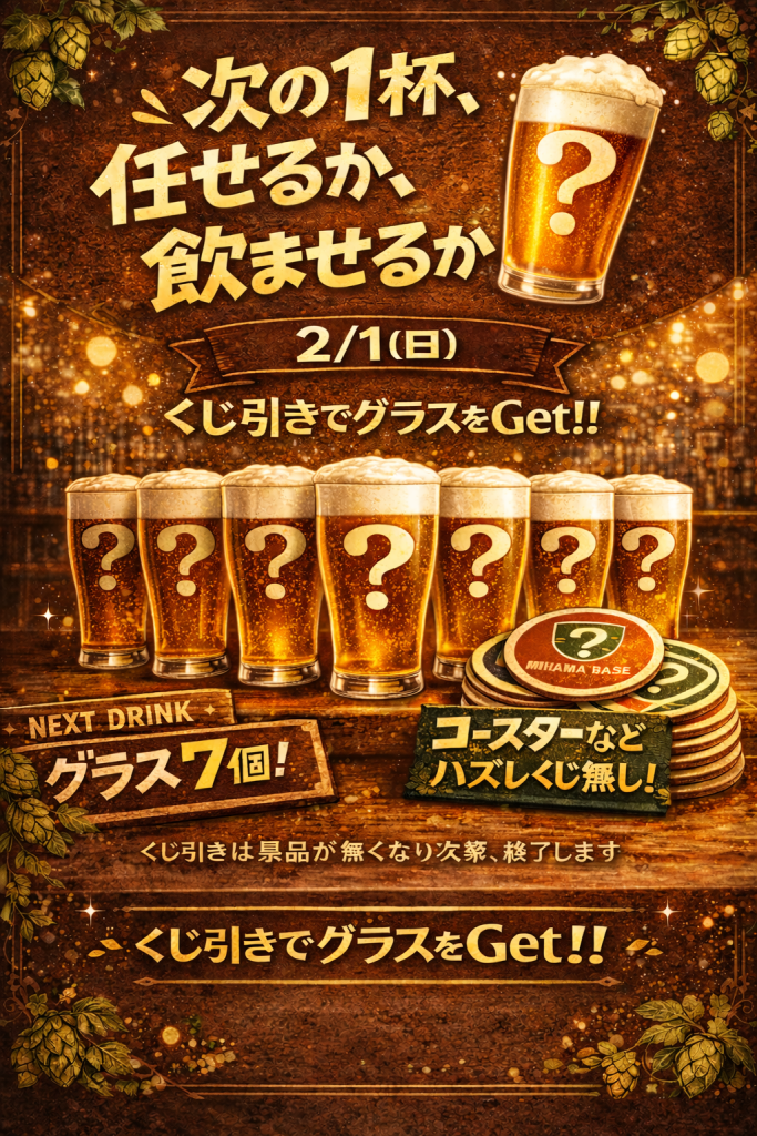 1月最後の華金です!!本日も稲毛海岸は新規開栓ありますよ!そして2/1(日)はブルワリーのグラスがあたるイベントもありますよ♪